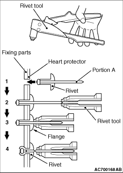 procedures. 1.Insert the rivet into a corresponding location. 2.Set the rivet tool at a portion A of rivet. 3.While pushing the flange surface of the rivet onto parts to be fixed with the rivet