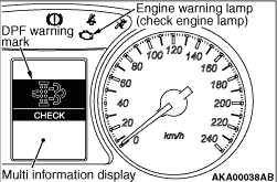 When the anticipated PM accumulation becomes larger in amount and reaches the specified level, the engine-ECU encourages the driver to drive under the driving conditions required for the DPF regeneration by showing the DPF warning mark on the multi information display. When the PM accumulated in the DPF reaches its clogged or damaged level, the engine-ECU warns the driver that the vehicle must be brought to the workshop by showing the DPF warning mark in the multi information display and illuminating the engine warning lamp. When the vehicle is brought into the shop with the DPF warning mark shown, service the vehicle in accordance with the following procedures.