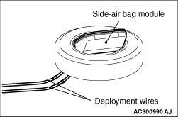 When the connector is disconnected, the two pins of side-airbag module are automatically shorted to prevent the unintentional deployment caused by the static or others. However, in preparation for the accidental deployment, store the air bag module on a flat place with the deployment surface facing upward. Also, do not put anything on it.