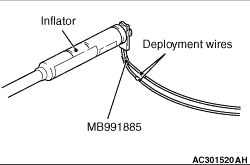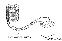 Disconnect the deployment wire connection at a place as far as possible from the inflator. Then, connect the wires to the removed vehicle battery to activate the inflator. 10.Discard the activated inflator according to the disposal procedures (Refer to ).