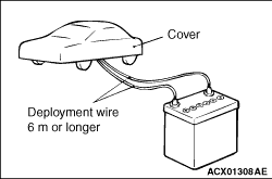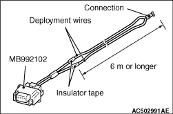 5.Connect the deployment wires of 6 m or more to each of the two wiring harnesses of special tool adapter harness (MB992102), and cover the connection areas with insulation tape. Keep the other ends of deployment wires connected to each other (shorted).