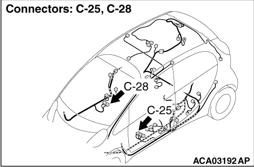 STEP 1. Connector check: C-25 front seat belt switch (LH) connector or C-28 front seat belt switch (RH) connector