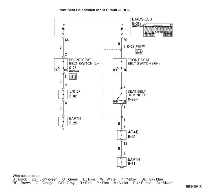 • Check the wiring harness between C-25 front seat belt switch (LH) connector terminal No. 1 and the C-317 ETACS-ECU connector terminal No. 66 <LHD> or 60 <RHD>. <front seat belt switch (LH)>