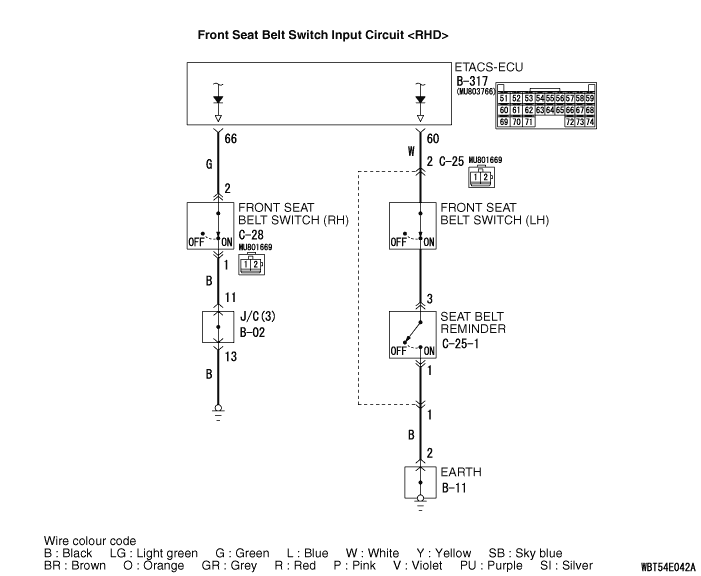 • Check the wiring harness between C-28 front seat belt switch (RH) connector terminal No. 1 and the C-317 ETACS-ECU connector terminal No. 60 <LHD> or 66 <RHD>. <front seat belt switch (RH)>
