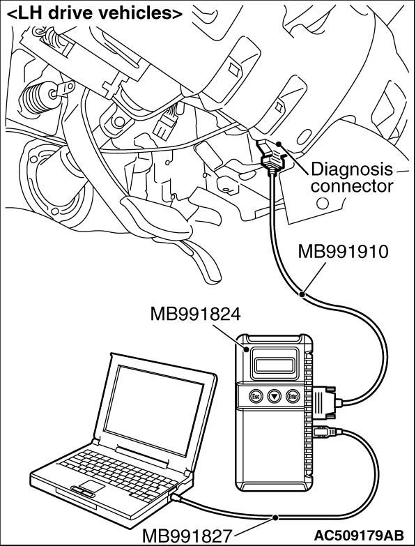 2.Start up the personal computer. 3.Connect M.U.T.-III USB cable (MB991827) to special tool Vehicle Communication Interface (V.C.I.) (MB991824) and the personal computer. 4.Connect M.U.T.-III main harness A (MB991910) to the V.C.I. 5.Connect the M.U.T.-III main harness A to the diagnosis connector. 6.Turn the V.C.I. power switch to the "ON" position.