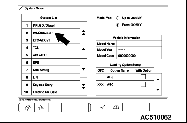 8.Select "IMMOBILIZER" in the "System Select" tag. Select the model year and push the OK button (Check each model if there is an option).Select "Coding" on the next screen, and select "Chassis No. Writing" on the further screen. |