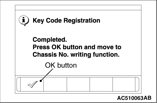 9.Push the OK button after "Key Code Registration" is displayed. 10.Push the OK button after "Completed. Press the OK button and move to Chassis No. writing function." is displayed. |