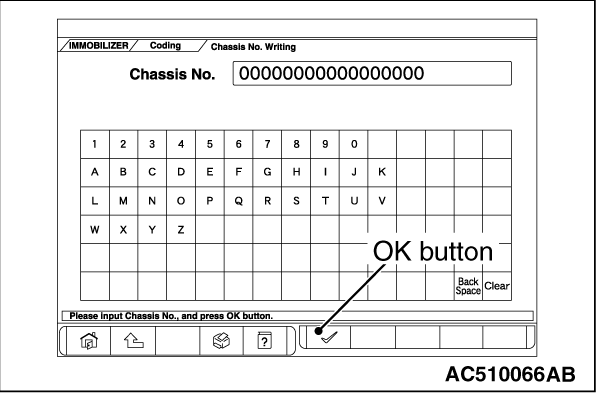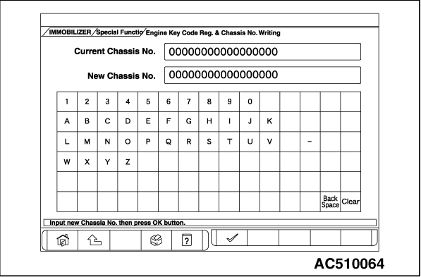 11.Enter the Chassis No. of registering vehicle and push the OK button. 12.Push the OK button after "Chassis No. Writing will start. Are you sure?" is displayed. 13.Return to the previous screen and "In Progress" is displayed at the lower-left corner on the screen. 14.Push the OK button after "Completed." is displayed. |