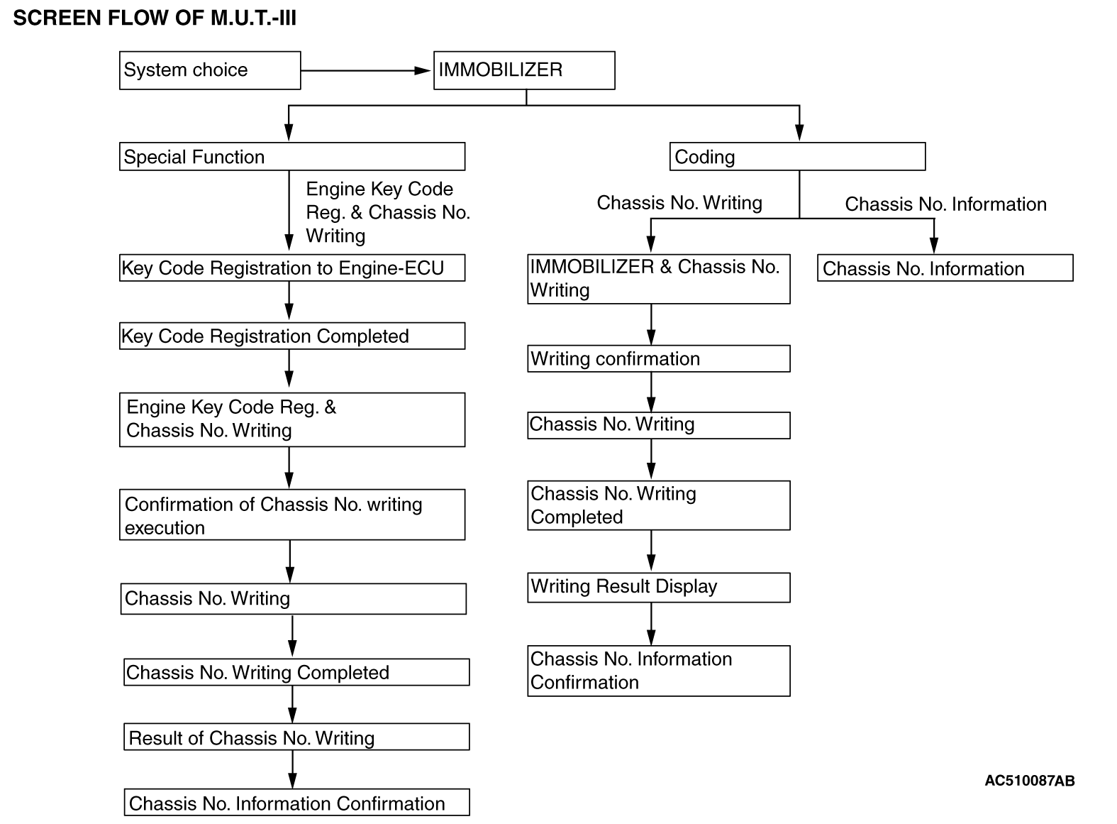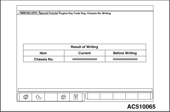 15.Chassis No. writing result is displayed. 16.Select "Chassis No. Information" on the "Coding" screen after the Chassis No. writing is completed, and check that the Chassis No. is changed. 17.Complete the M.U.T.-III. 18.Disconnecting the M.U.T.-III is the reverse of the connecting sequence, making sure that the ignition switch is at the "LOCK" (OFF) position. |