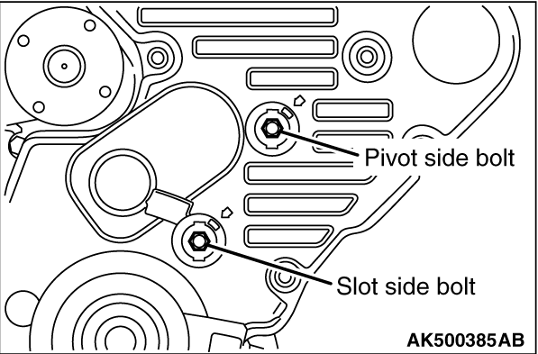 5.Loosen the tensioner pivot side bolt 1 turn and slot side nut 1 or 2 turns.