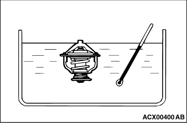 1.Immerse the thermostat in water, and heat the water while stirring. Check the thermostat valve opening temperature. Standard value: 82 ± 2°C |
