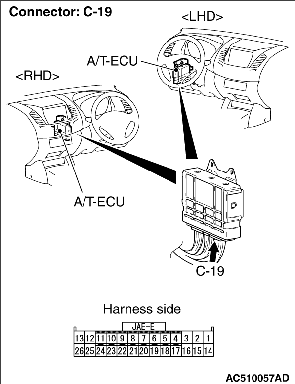 (3)Measure the voltage between A/T-ECU connector C-19 terminal No.14 and earth. OK: 6 -
