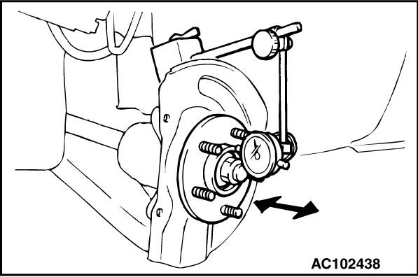 3.Attach a dial gauge as shown in the illustration, and then measure the axial play while moving the hub in the axial direction. Limit: 0 mm 4.If axial play exceeds the limit, disassemble the front hub assembly and check the parts. 5.Install the brake disc, caliper assembly and tighten the caliper assembly mounting bolts to the specified torque 113 ± 9 N·m.