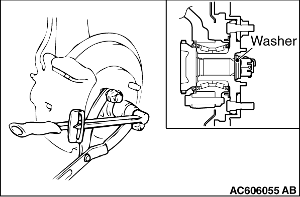 2.Using special tool front hub and flange yoke holder (MB990767), tighten the front hub nut. At this time, tighten the front hub nut to the specified torque in expectation of final tightening.