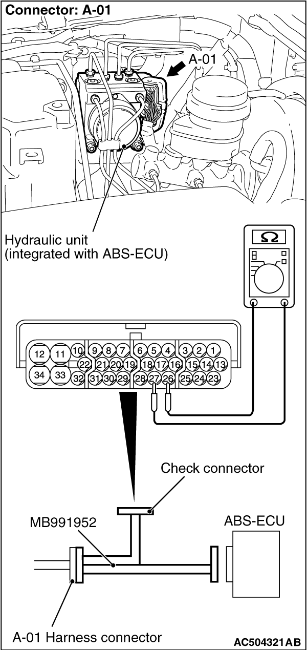 (1)Disconnect the connector A-01, and connect special tool ABS check harness (MB991952) to the wiring harness-side connector.