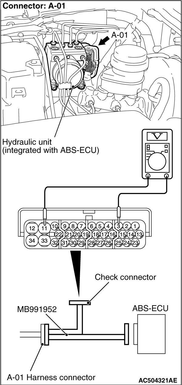 (1)Disconnect the connector A-01, and connect special tool ABS check harness (MB991952) to the wiring harness-side connector.