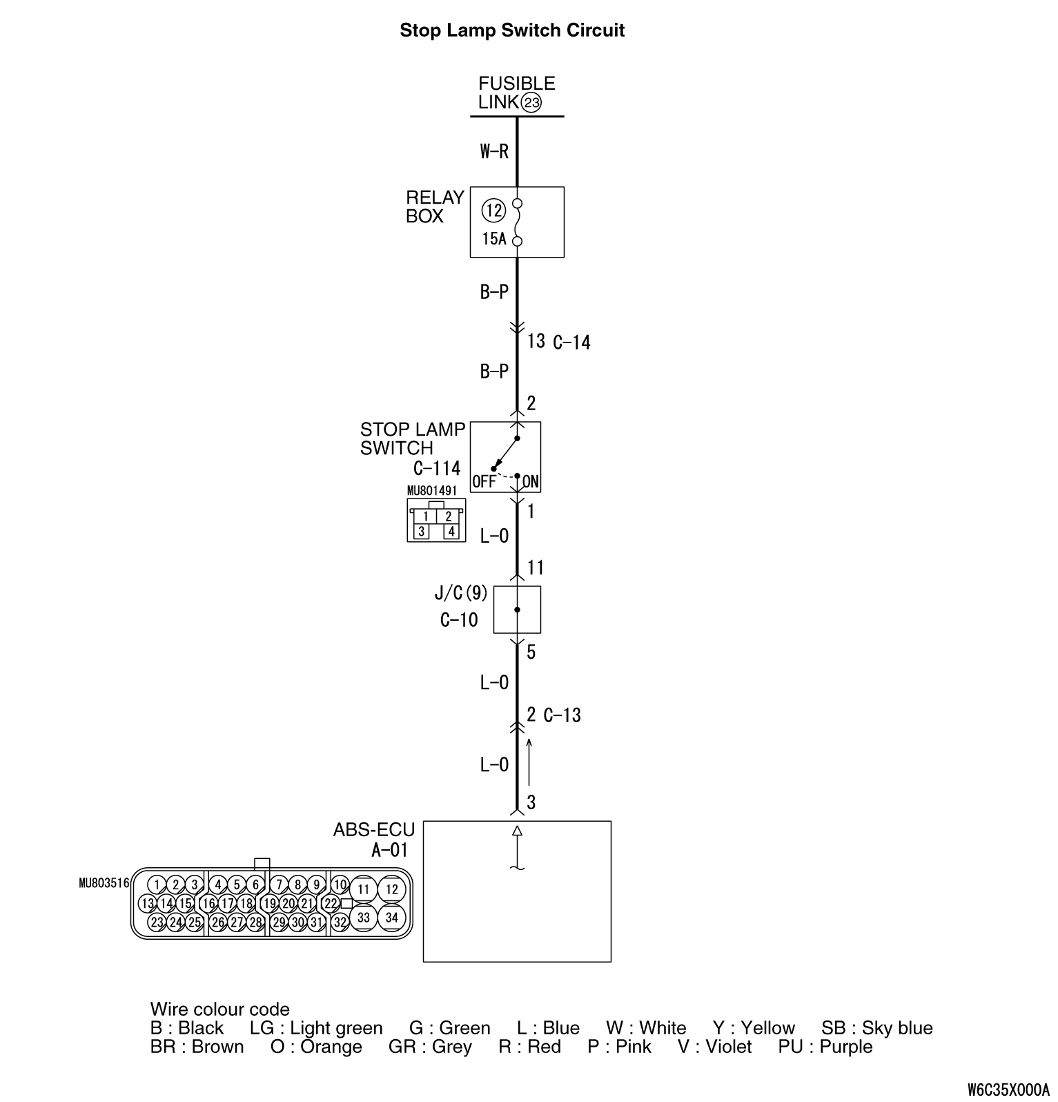 An open or short circuit may be present between the stop lamp switch and ABS-ECU. Repair the wiring harness between ABS-ECU connector A-01 terminal 3 and stop lamp switch connector C-114. Then go to Step 8.