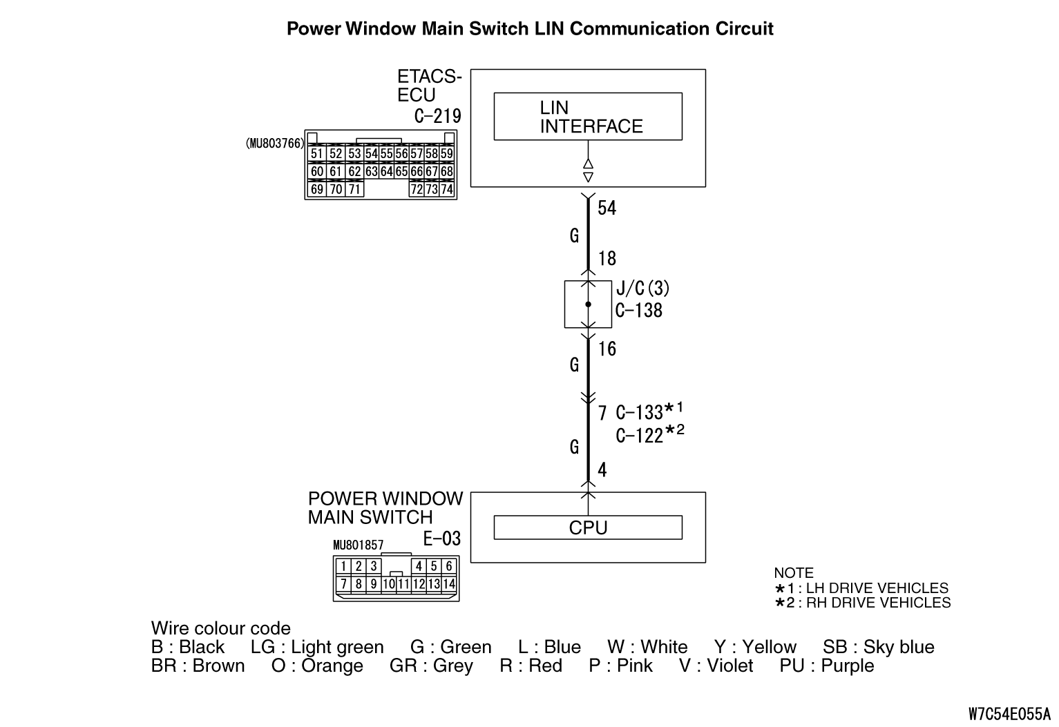 the LIN bus lines between the power window main switch and the ETACS-ECU (Refer to GROUP 00,