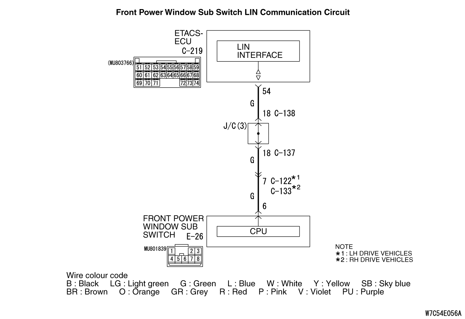 the LIN bus lines between the front power window sub switch and the ETACS-ECU (Refer to GROUP
