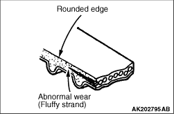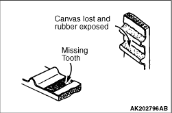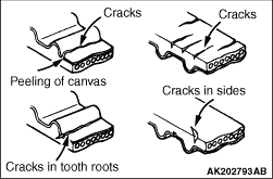 The timing belts must be checked closely. Should the following defects be evident, replace