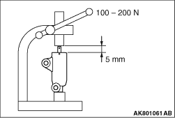 1.Set the auto tensioner to the longitudinal type press as shown in the illustration. 2.Slowly press down the rod, two or three times, to the cylinder end plane. 3.When the rod protrusion has approximately 5 mm, apply the load of 100 -