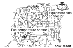 1.Disconnect the fuel temperature sensor connector. 2.Measure resistance between terminal No. 1 and No. 2 Standard value: Approximately 2.0 - 3.0 kΩ (at 20 °C) 3.If not within the standard value, replace the supply pump assembly. After replacing the supply pump, learn the supply pump. (Refer to GROUP 00 - Precautions Before Service - What The common Rail Engine Learns ).