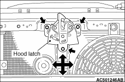 3.After the adjustment, tighten the hood latch mounting bolts.