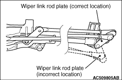 caution Wiper link rod plate at left end should be located as shown in the illustration (dotted line shows incorrect location).