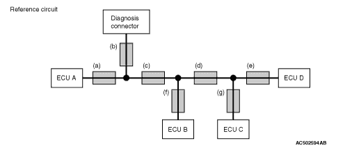 When time-out diagnosis code associated with ECU A is stored in ECUs B, C and D, or time-out diagnosis code associated with ECUs B, C and D is stored in ECU A, or "bus off" diagnosis code is stored in ECU A, CAN bus line (a) or (c) is suspected. When diagnosis code is not stored in ECU A, the power supply to ECU A is suspected.