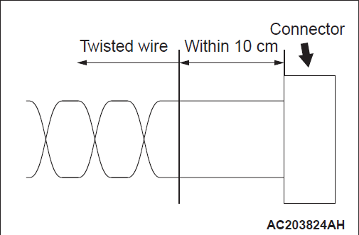If you repair the wire due to a defective connector or its terminal or harness wire, you should cut the wire so that the strand end of the twist wire should be within 10 cm from the connector as shown. If it exceeds 10 cm, twist the wiring harness just like the original twisted wire. If the strand end exceeds 10 cm, a communication error may be caused.