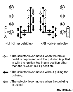 note Because the misoperation preventive device is equipped, the shift lever cannot be moved out of the P position unless the ignition switch is turned to the position other than LOCK (OFF) and the brake pedal is depressed.