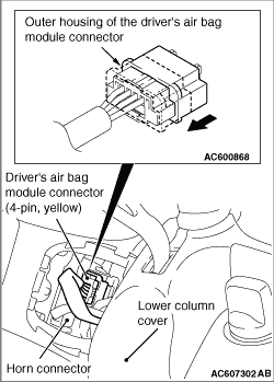 Slide the outer housing of the driver’s air bag module connector in the arrow direction shown and disconnect the connector.
