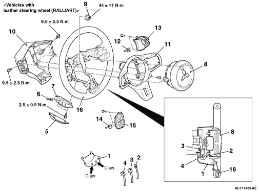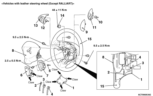 • Before removing the steering wheel and driver’s air bag module assembly, refer to GROUP 52B - Service Precautions and Air Bag Module and Clock Spring <Except for RALLIART>, <RALLIART>.