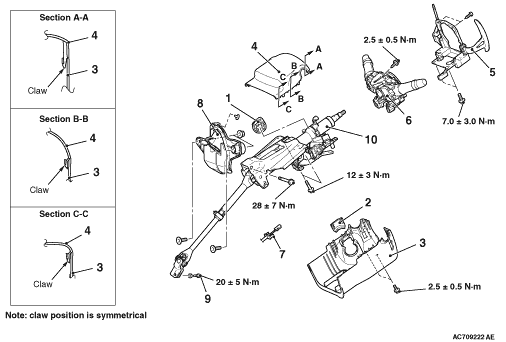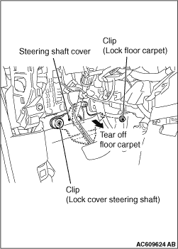 • Before removing the steering wheel and driver’s air bag module assembly and Knee Air Bag Module refer to GROUP 52B, Service Precautions <Except for RALLIART>, <RALLIART>, Driver’s Air Bag Module(s) and Clock Spring <Except for RALLIART>, <RALLIART> and Knee Air Bag Module .