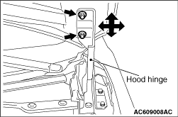 1.Loosen the hood hinge mounting nuts but do not remove them. Move the hood hinge back/forth and left/right to align the hood level. 2.After the adjustment, tighten the hood hinge mounting nuts to 9.5 ± 3.5 N·m.