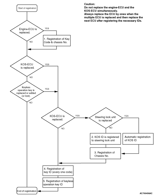 • Do not replace the engine-ECU and KOS-ECU at the same time. When replacing several ECUs, always replace one ECU at a time, register the necessary IDs in it, and then replace the next ECU.
