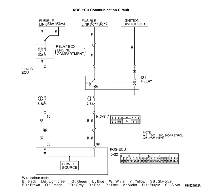 STEP 2. Check the wiring harness between the C-23 KOS-ECU connector terminal No. 38, 39 and the C-317 ETACS-ECU connector terminal No. 10, 5 and between the C-23 KOS-ECU connector terminal No. 14 and the body earth. |