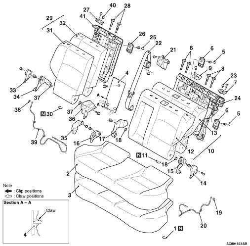 Peel off the rear seatback cover and pad to access the headrestraint guides. Pull off the guides upwards while pushing the tabs (arrows) as shown. |