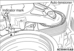 Make sure that the indicator mark is within the area marked with A in the illustration. 2.If the mark is out of the area, replace the drive belt. (Refer to GROUP 16 - Alternator