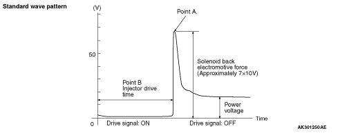 • Counter electromotive force in the solenoid coil: When the signal from the engine-ECU is OFF, the injector coil can generate a counter electromotive force (Approximately 65 to 75 V).