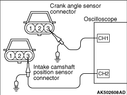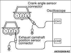 3.Connect the probe of each channel of the oscilloscope to terminal No. 3 of the exhaust camshaft position sensor connector and terminal No. 3 of the crank angle sensor connector, respectively.