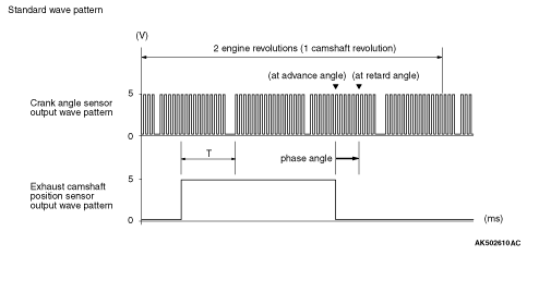 • Whether retardation or advance can be defined as a more or less difference in time from when the crank angle sensor output wave falls to when the exhaust camshaft position sensor output wave rises or falls.