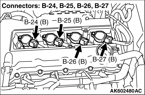 B-26 and B-27 (terminal No. 1) ignition coil connectors and body earth.