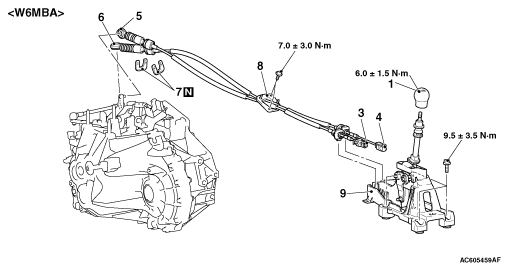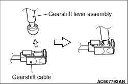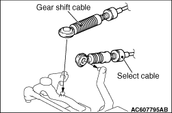 Securely fit the tips of the gearshift cable and the select cable. 3.Move the shift lever and gearshift lever to all positions and check that the operation