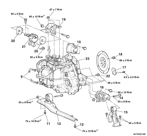 • The fasteners marked with *1 should be temporarily tightened first and then fully tightened with the engine weight applied on the vehicle body.