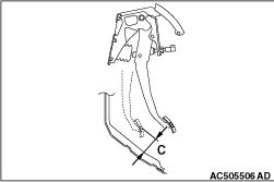 2.Start the engine and depress the brake pedal with approximately 500 N, and measure clearance between the brake pedal and the floor panel. Standard value (C): 80 mm or more 3.When the clearance is not within the standard value, check for the air in the brake line and thickness of the disc brake pad, and correct or replace as necessary. 4.Recover the floor carpet under the brake pedal.