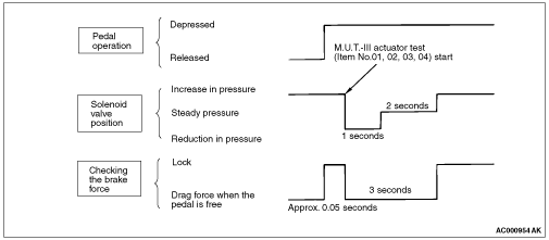 4.When carrying out the actuator tests No. 01 to 04, perform the actuator tests using M.U.T.-III while depressing the brake pedal. When carrying out the actuator tests, rotate the wheel by hands to confirm that the braking force changes.