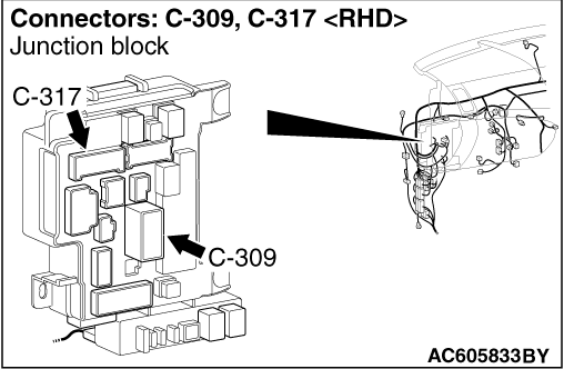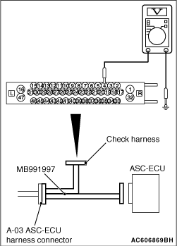 (1)Disconnect the ASC-ECU connector, connect special tool ASC check harness (MB991997) to