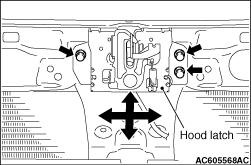 2.Loosen the hood latch mounting bolts but do not remove them. Move the hood latch up/down and left/right to align the hood level and adjust the hood striker engagement.