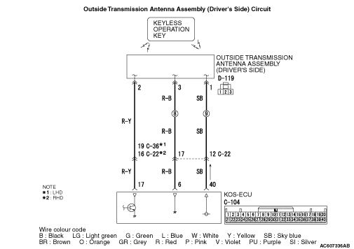 STEP 2. Check the wiring harness between the D-119 outside transmitter antenna assembly (driver’s side) connector terminal Nos. 1, 2, 3 and the C-104 KOS-ECU connector terminal Nos. 40, 17, 6.